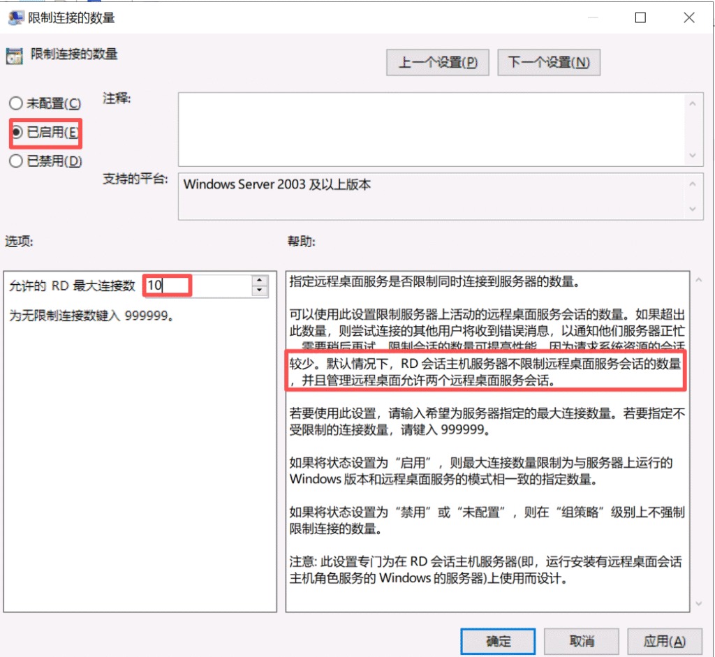 默认情况下,Windows Server允许最多两个用户同时登录。如果要支持更多的用户并发登录,则需要组策略启用会话连接数和安装远程桌面服务