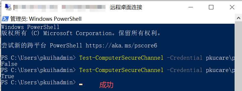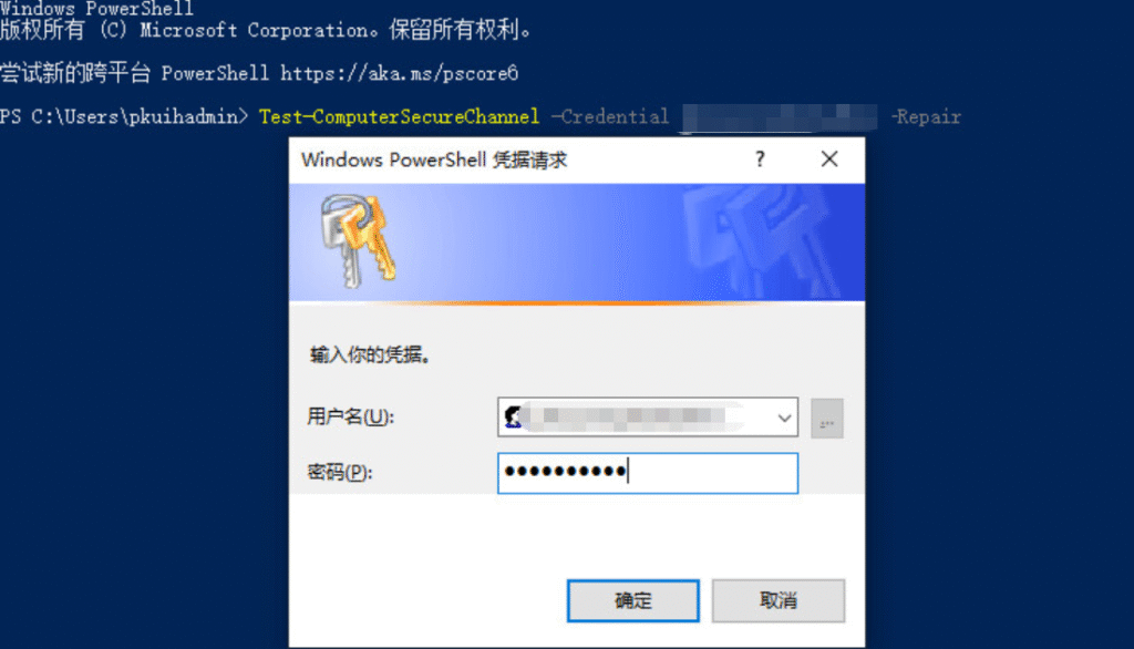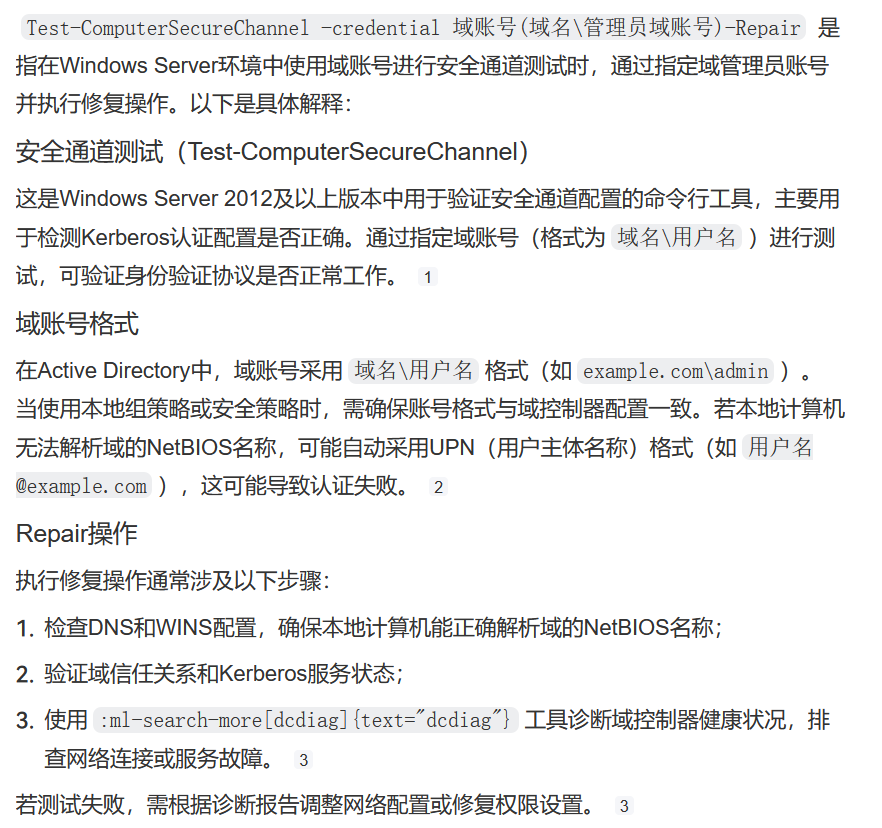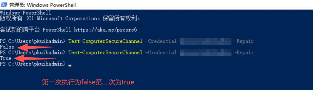Test-Computersecurechannel -credential 域账号(域名\管理员域账号) -Repair