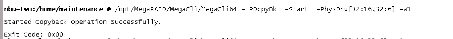 /opt/MegaRAID/MegaCli/MegaCli64 - PDcpyBk  -Start  -PhysDrv[32:16,32:6] -a1