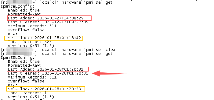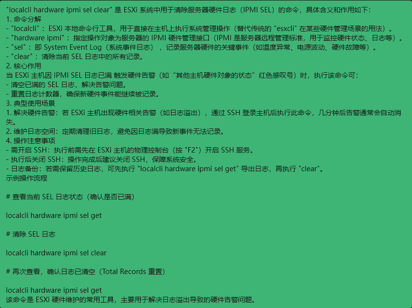 localcli hardware ipmi sel get 查看当前 SEL 日志状态(确认是否已满)