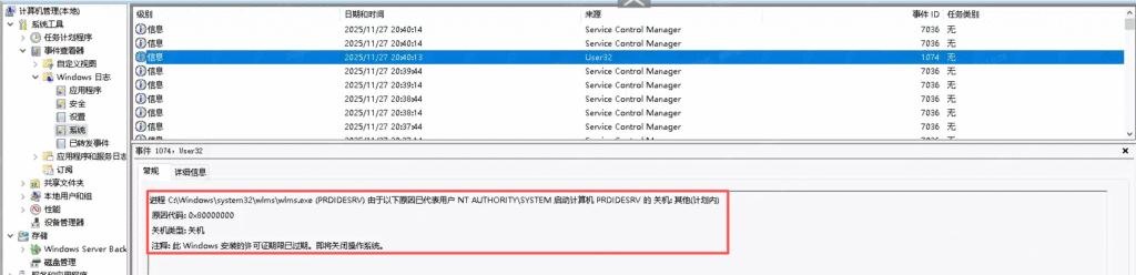 通过事件查看器得到是因为Windows未激活导致的关机 因为其评估版原因 而标准版、数据中心版未激活不会出现该问题